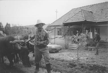 Eugen ploughs our garden with two buffaloes for this winter's potatoes.
